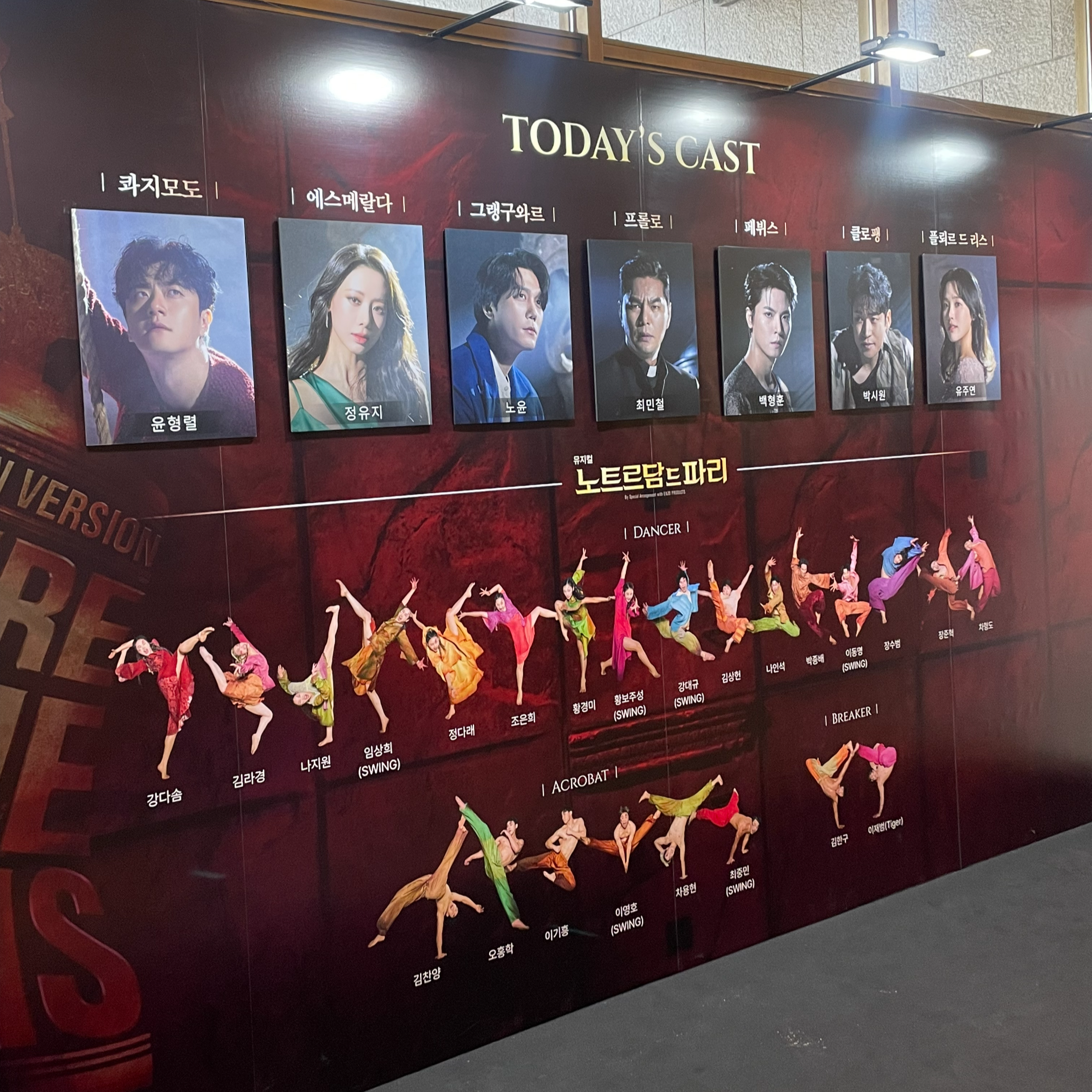 이번 노트르담 드 파리 뮤지컬에는 윤형렬, 정성화, 마이클 리, 민영기 등의 정상급 배우들이 출연하는데요, 저는 윤형렬, 정유지, 노윤, 최민철, 백형훈, 박시원, 유주연 캐스팅의 공연을 관람했습니다. 듣던대로 윤형렬 배우님은 엄청난 성량으로 무대를 압도했고, 개인적으로 에스메랄다역 정유지님의 음색에 반했습니다. 공연 내내 노래 실력 뿐만 아니라 고운 춤선이 눈에 띄었는데 찾아보니 아이돌 출신의 뮤지컬 배우셨습니다.