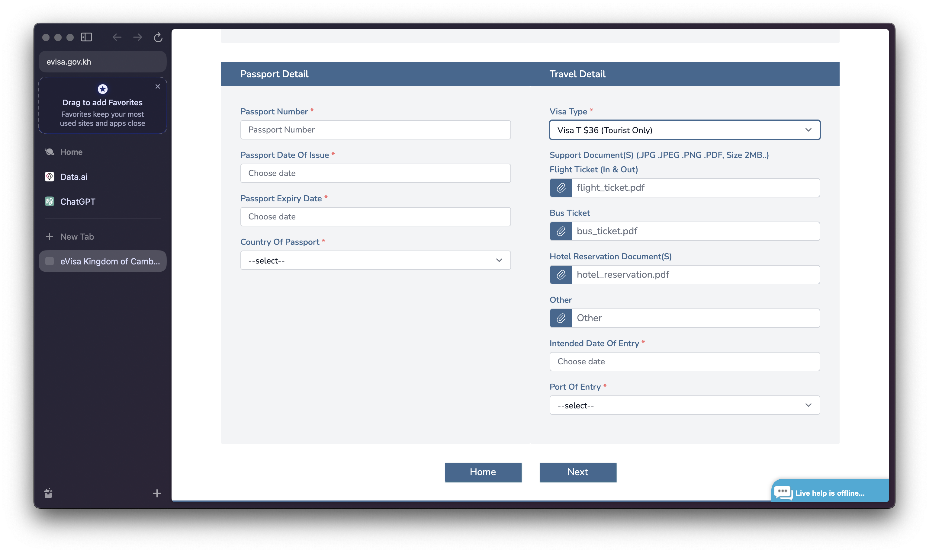 여권 정보를 입력한 뒤, Visa Type 에 'Visa T (Tourist Only)'를 선택하고 나머지 정보를 입력하면 된다.