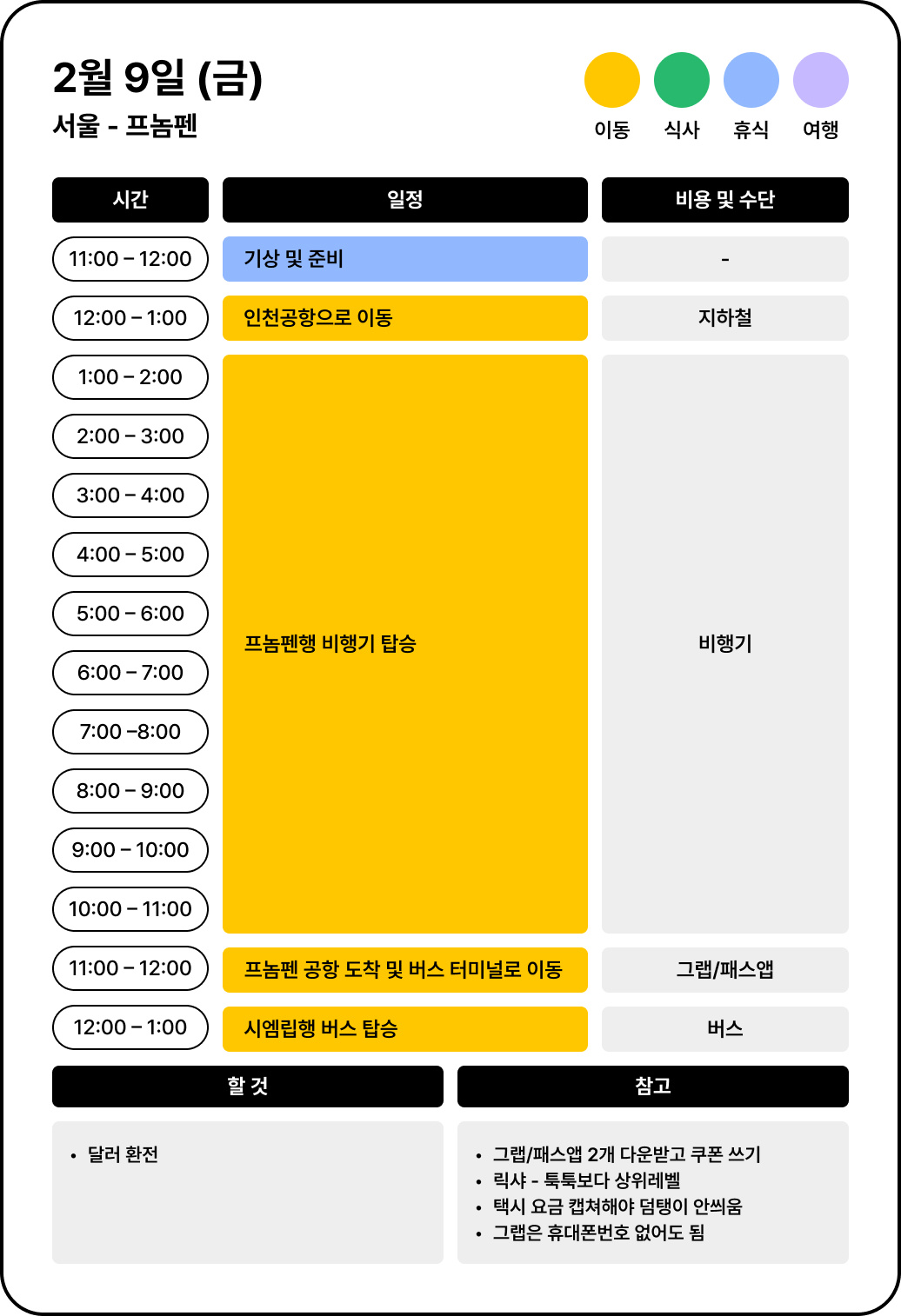 서울에서 프놈펜까지 이동하는데만 하루를 전부 쓰는 스케줄이다.