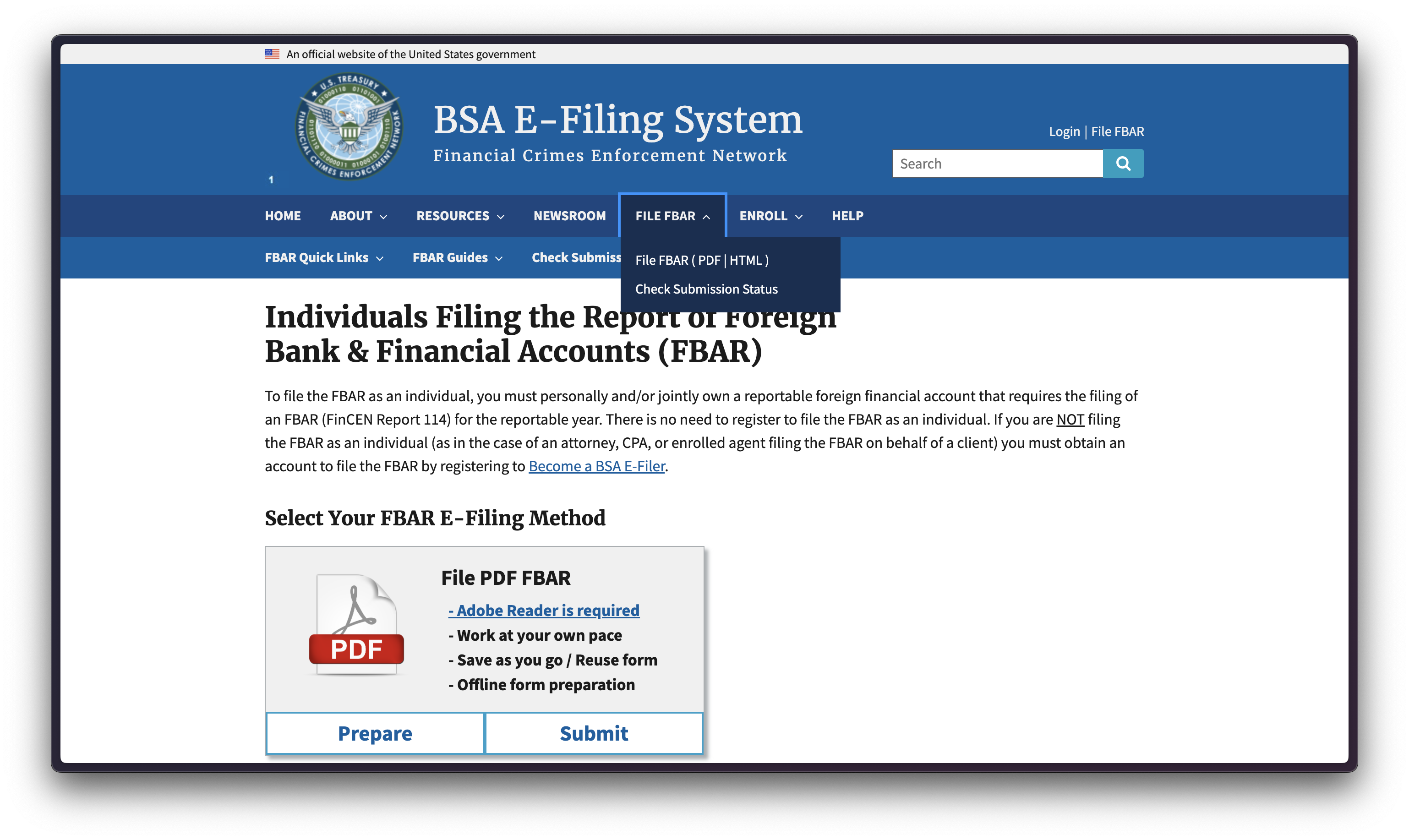 상단 메뉴 중 FILE FBAR > File FBAR (PDF | HTML) 선택