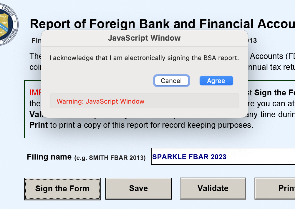 모든 계좌 정보를 추가한 후, 다시 첫번째 페이지로 돌아가서 'Sign the Form'버튼을 누른다. 그럼 아래와 같은 팝업이 뜨는데, 'Agree'를 누르면 된다.