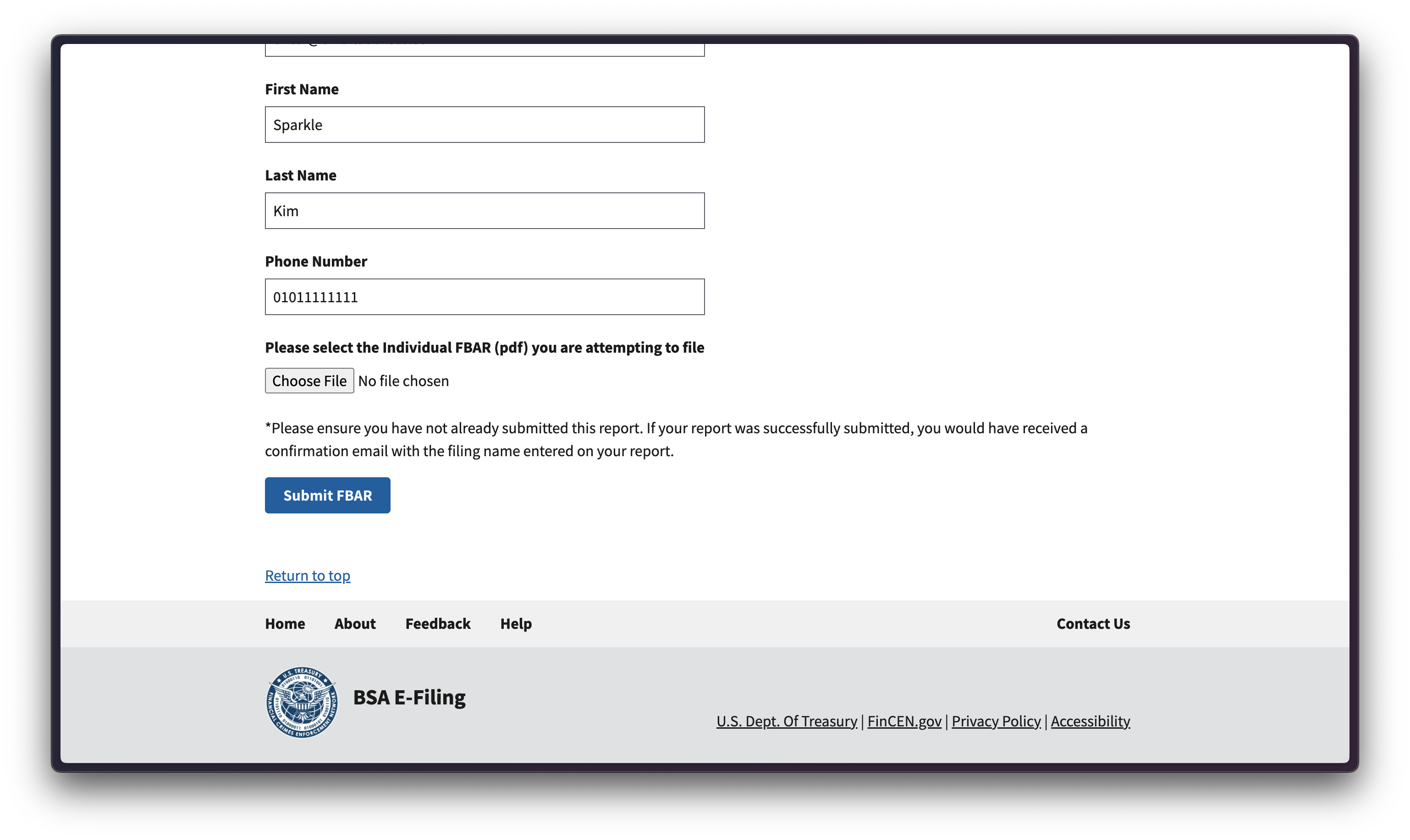 Submit을 누르면 아래와 같은 페이지가 뜬다. 빈칸을 채워넣고 아까 작성한 PDF 파일을 첨부한 뒤 'Submit FBAR' 버튼을 누르면 끝!