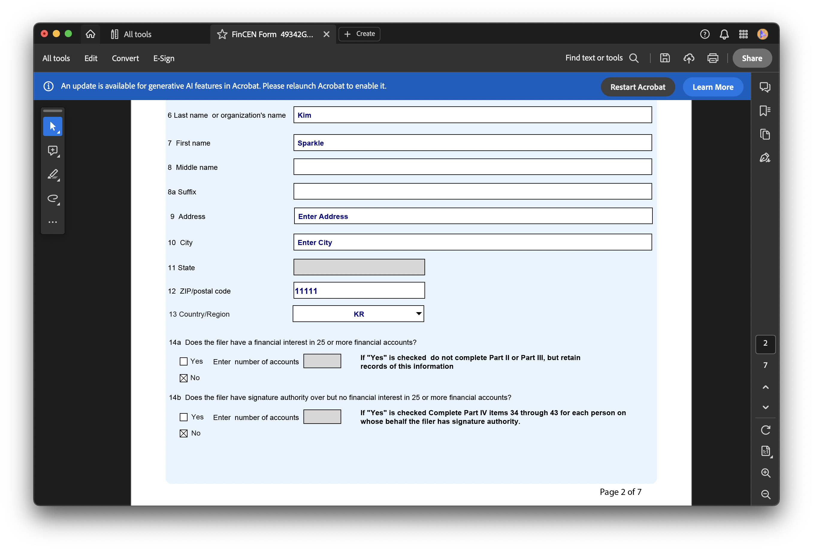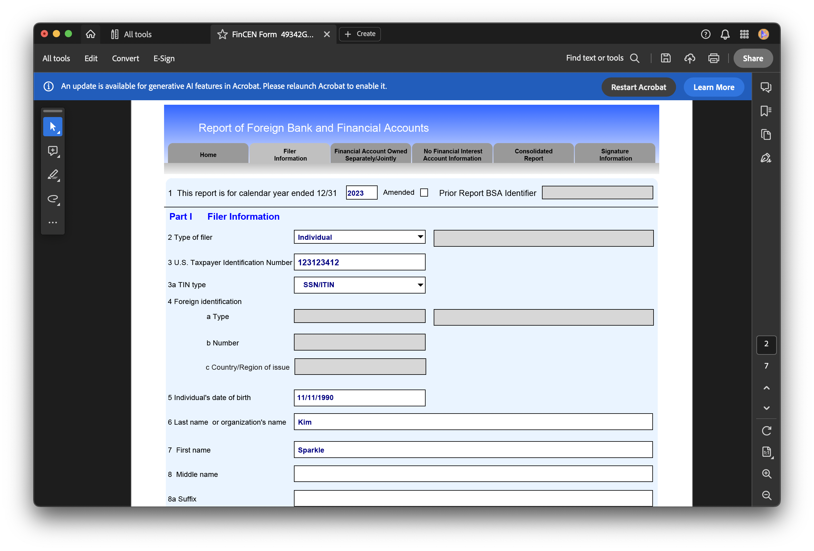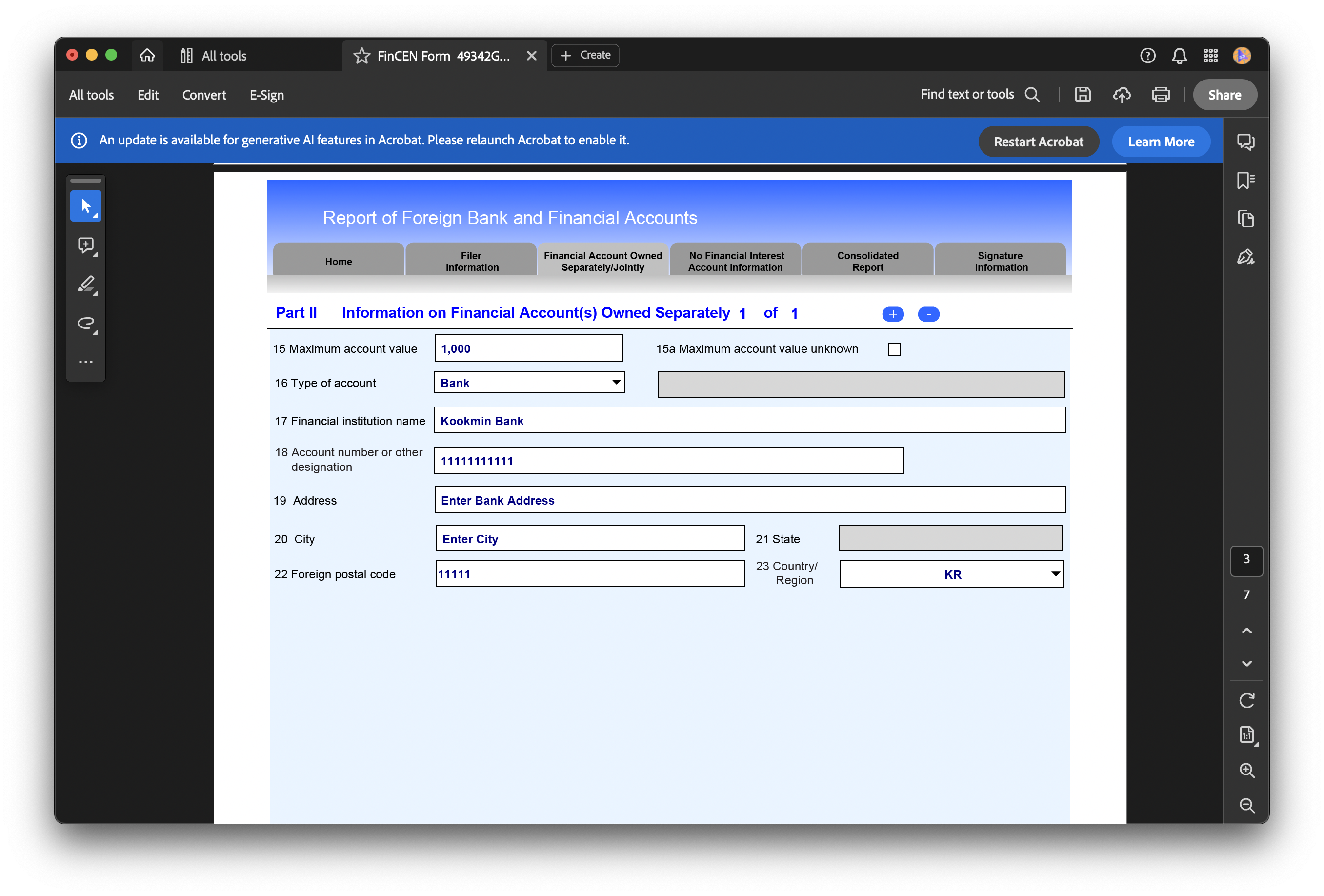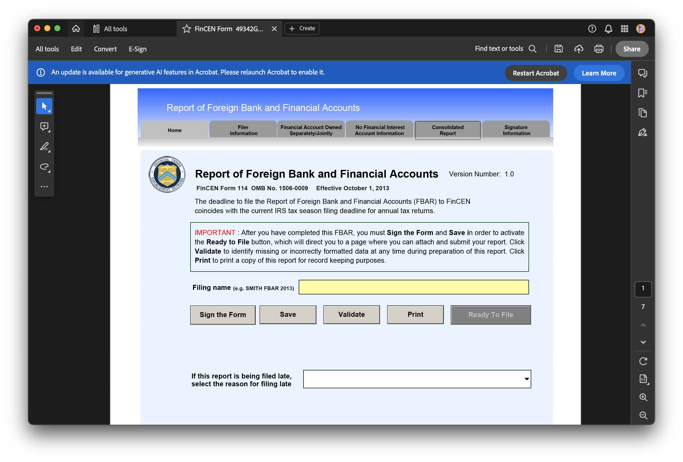 PDF FBAR 섹션의 'Prepare'버튼을 누르면 파일이 다운로드 된다. Acrobat Reader 로만 파일을 열 수 있으니 신고서 작성에 앞서 아래 링크를 통해 미리 설치해두어야 한다.