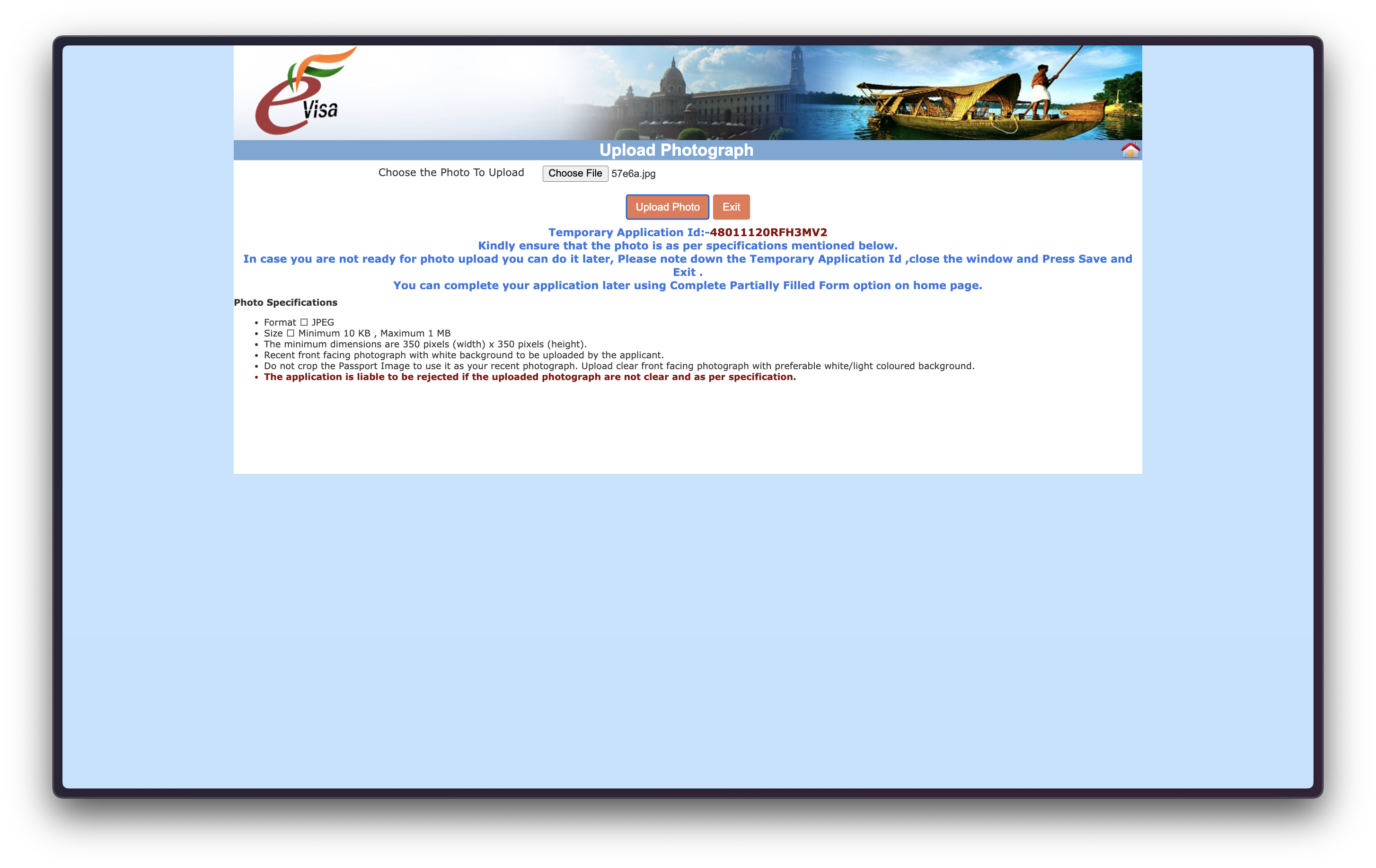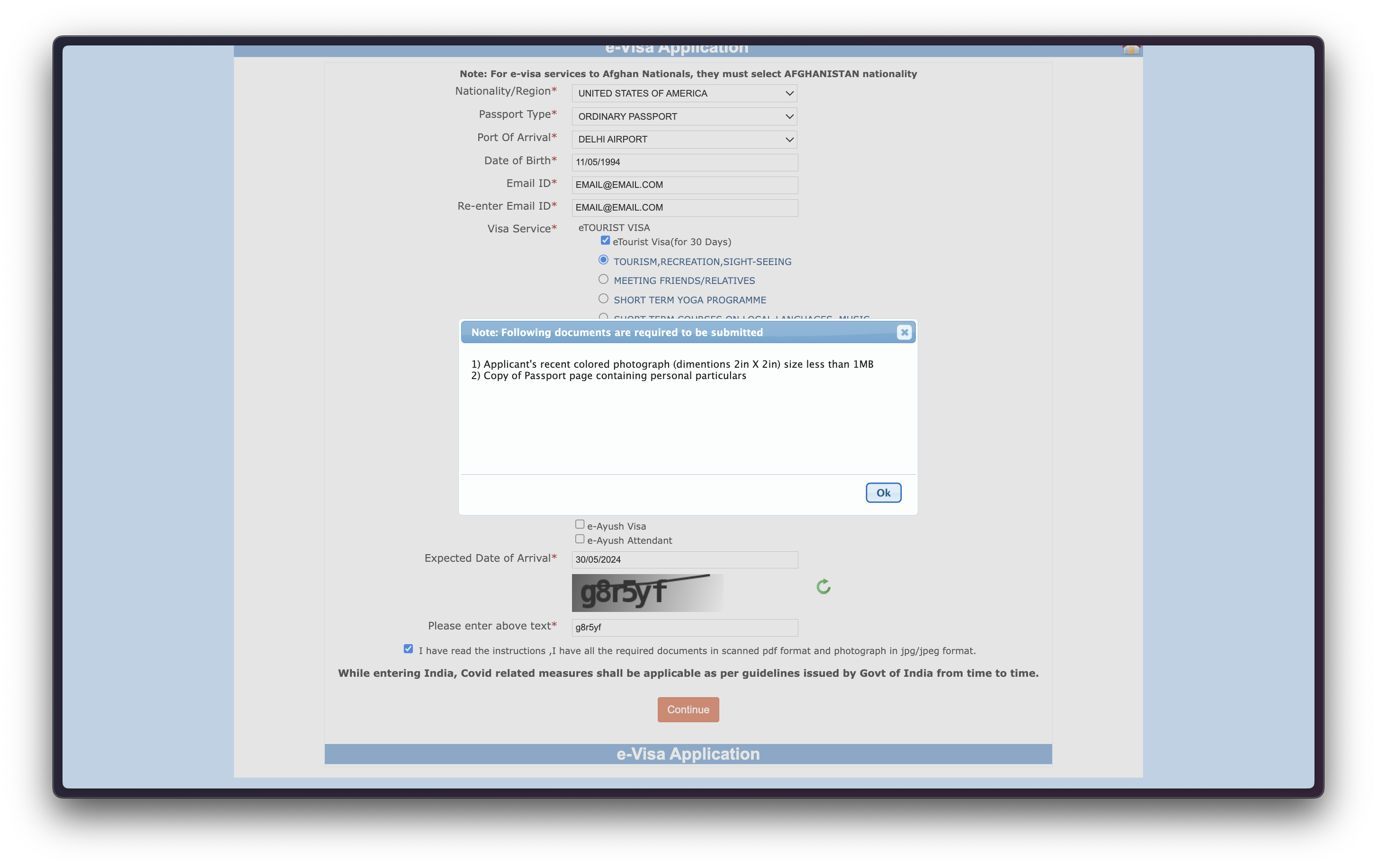 Continue를 누르면 비자 사진과 여권 스캔본을 준비하라는 팝업이 뜬다.