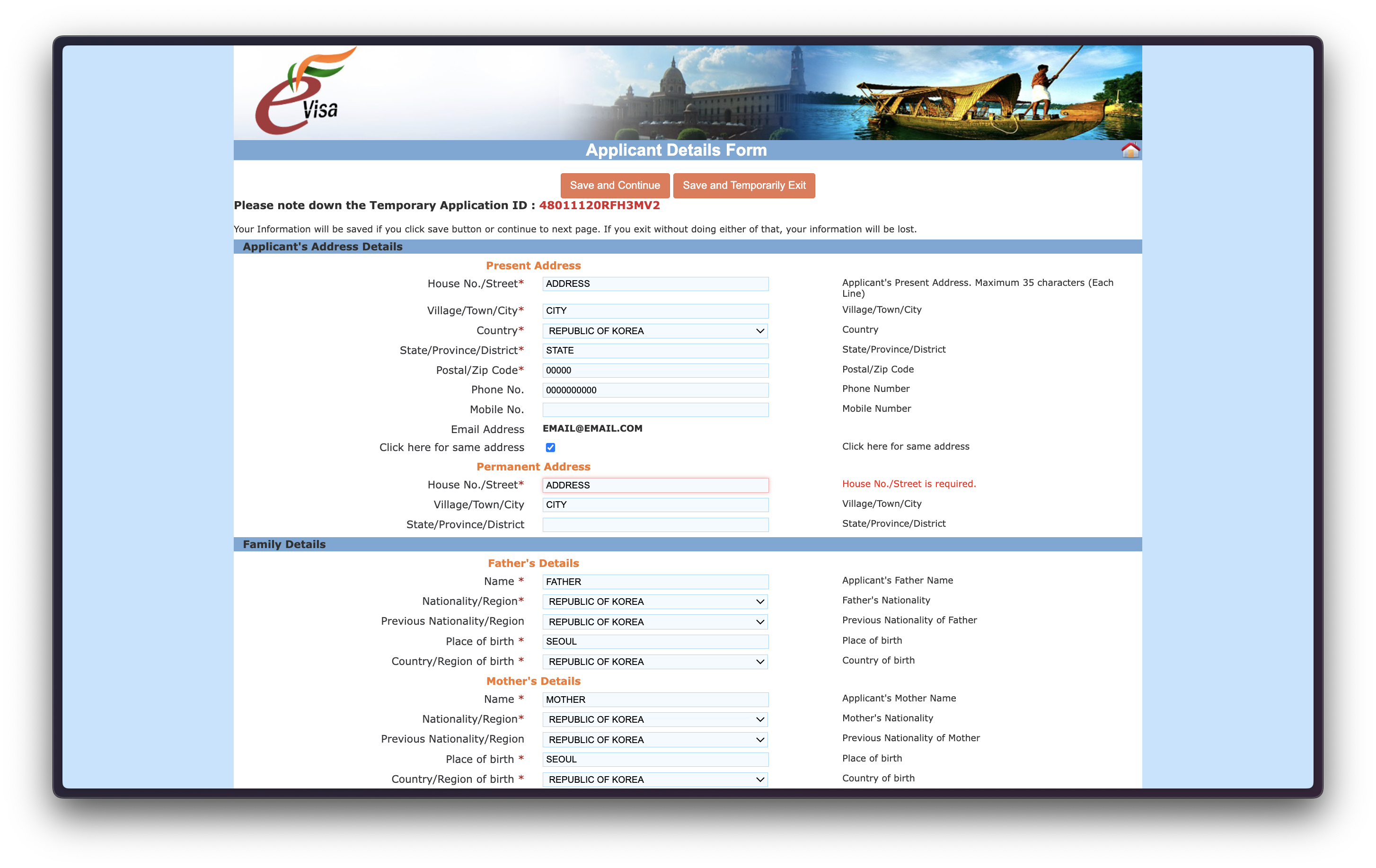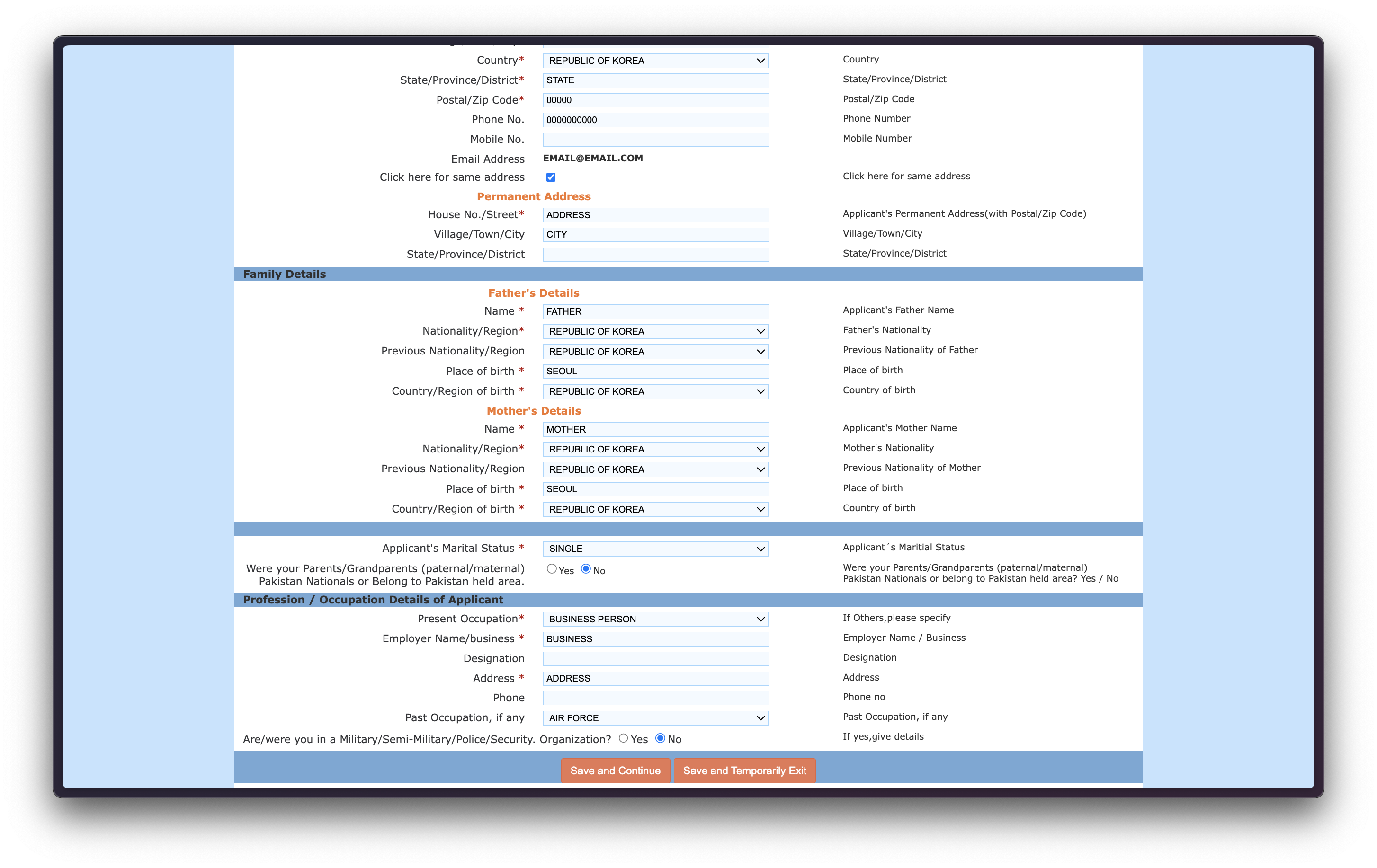 거주지 주소와 이메일 주소 등을 입력한 후 엄마 아빠의 정보를 입력한다. 여행 비자 신청할때 비상 연락망 정보를 기입한 적은 있어도 부모님 정보 물어보는건 처음이라 당혹스럽지만 쓰라니 써야지.