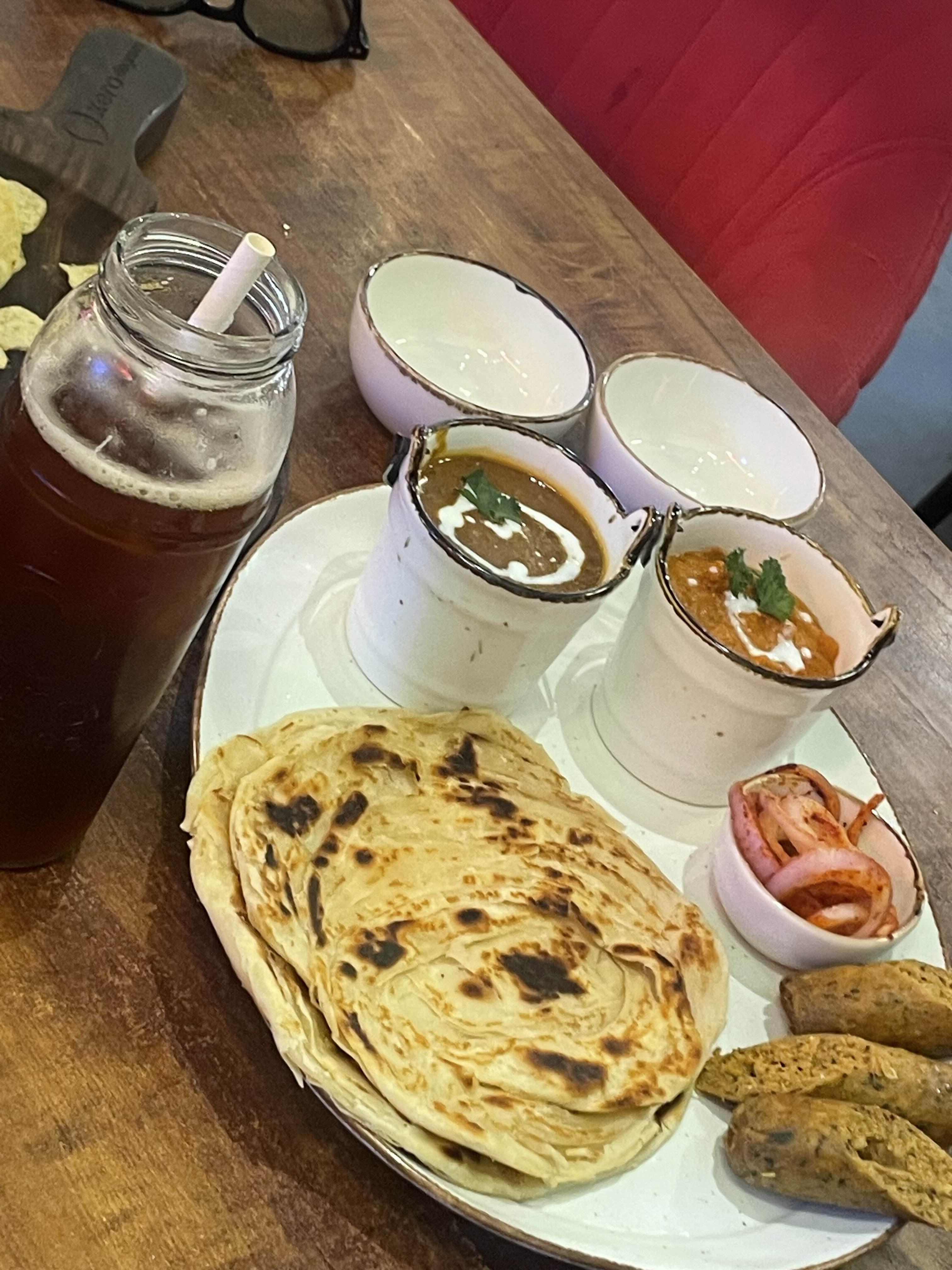 한입 먹자마자 감탄스러웠고 마지막 입까지 감동적인 맛이었다. 아래는 추가로 시킨 커리 플래터인데 두가지 종류의 커리와 난을 준다. 커리엔 치킨과 렌틸콩이 들어가 있고 사이드로 인도의 김치같은 양파 절임을 주는데 다 같이 싸먹으면 정말 조화롭다.
